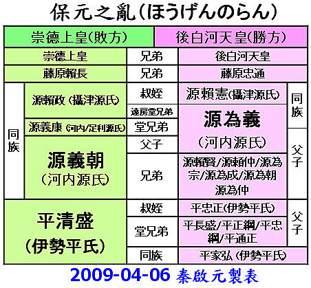 崇德上皇與藤原賴長陣營裏主要以源義家之孫源為義、平正盛之子平忠正、伊勢平氏的平家弘等人為主,